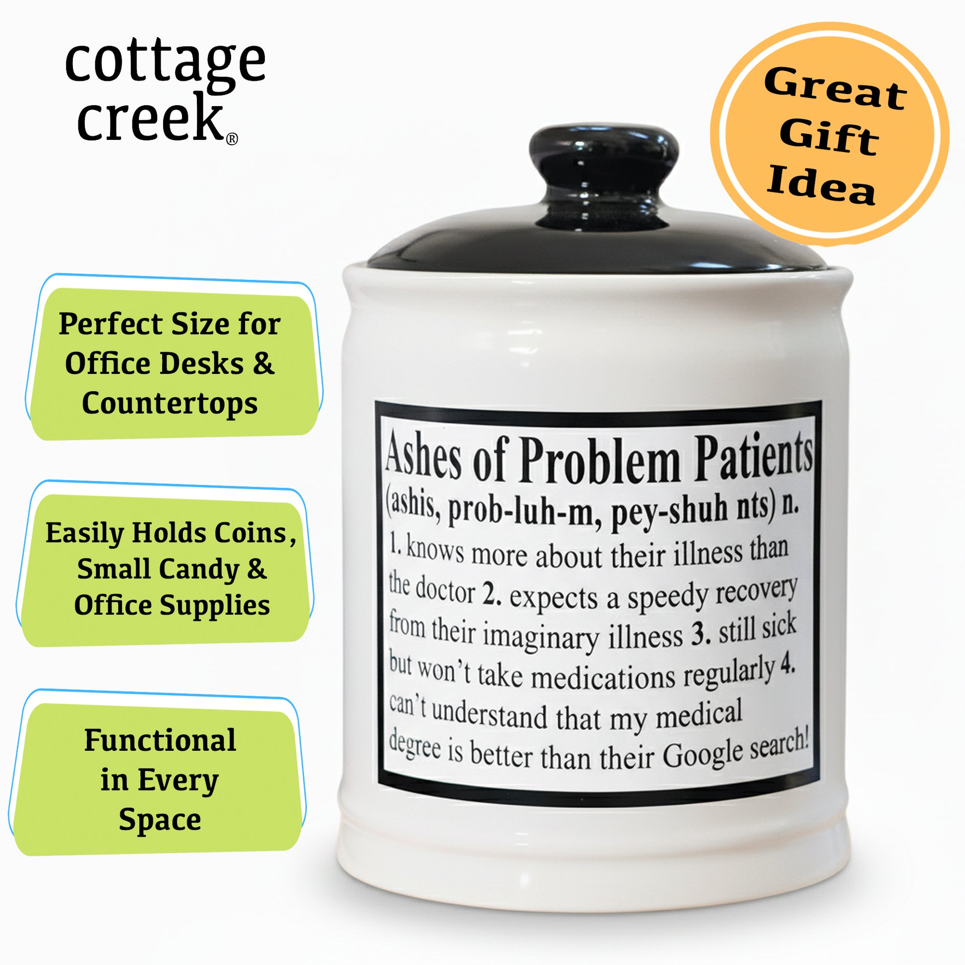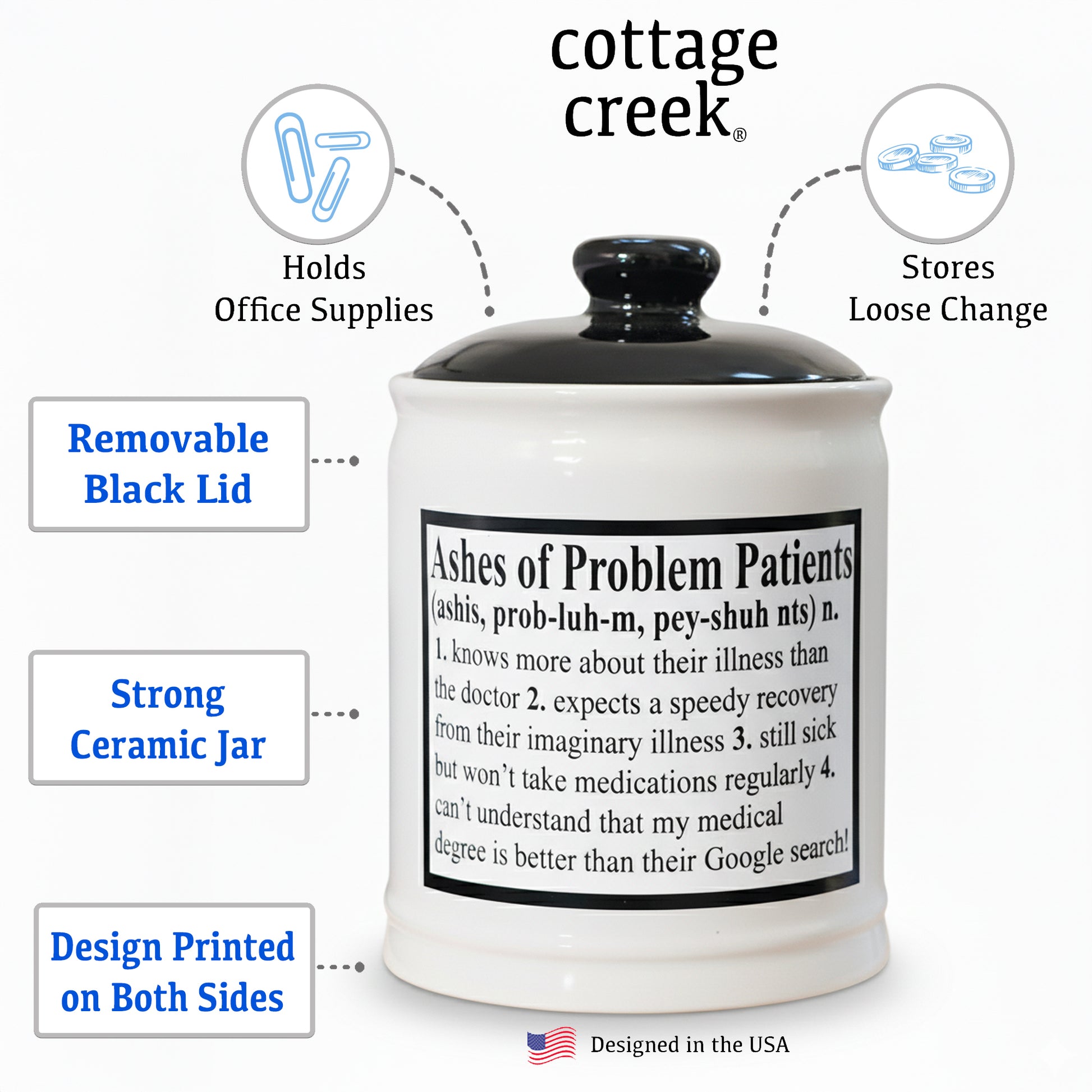 Cottage Creek Ceramic Piggy Bank, Money Jar, Ashes of Problem Patients White and Black 6" Ceramic Change Jar with Lid, Cute Jars for Nurses, Doctors, Women and Men
