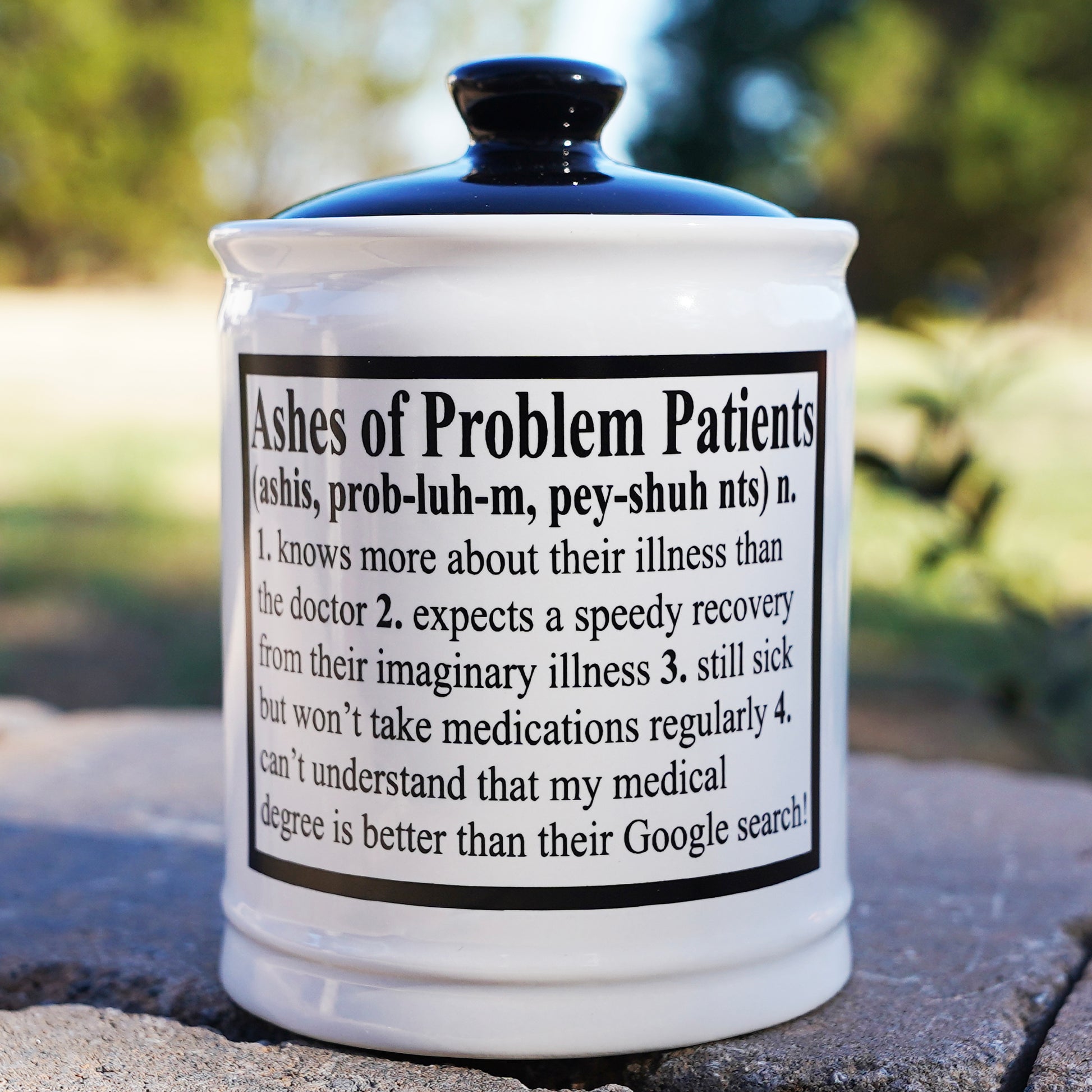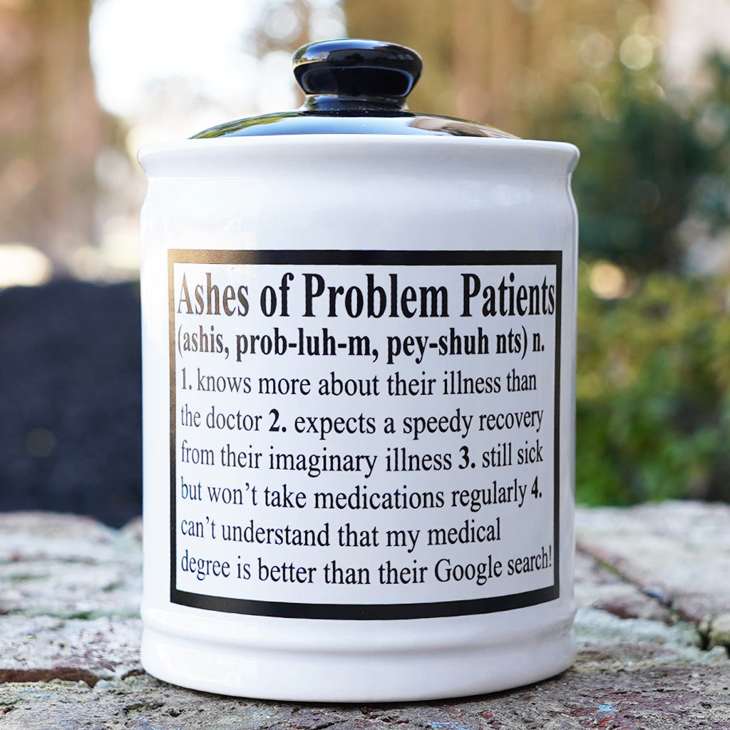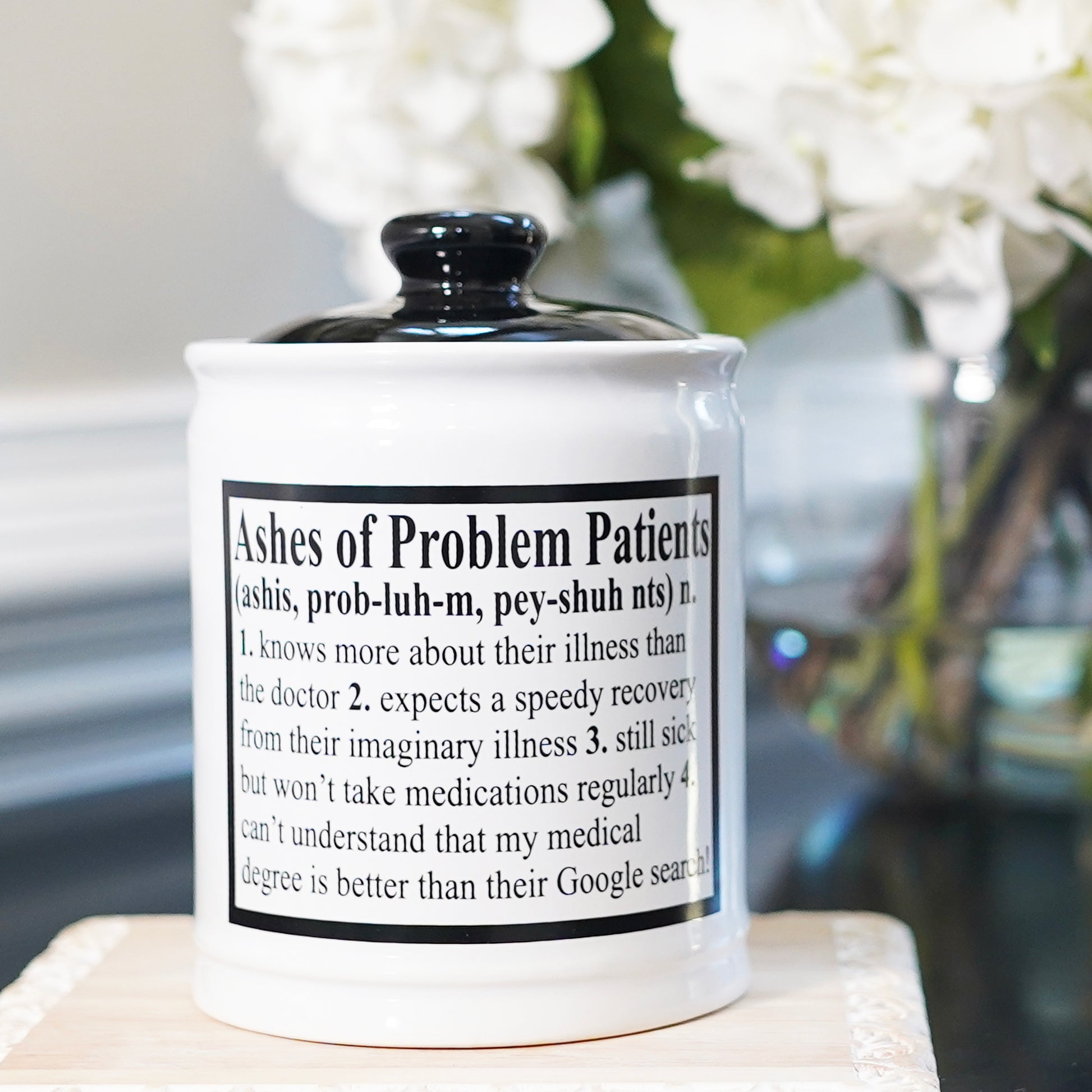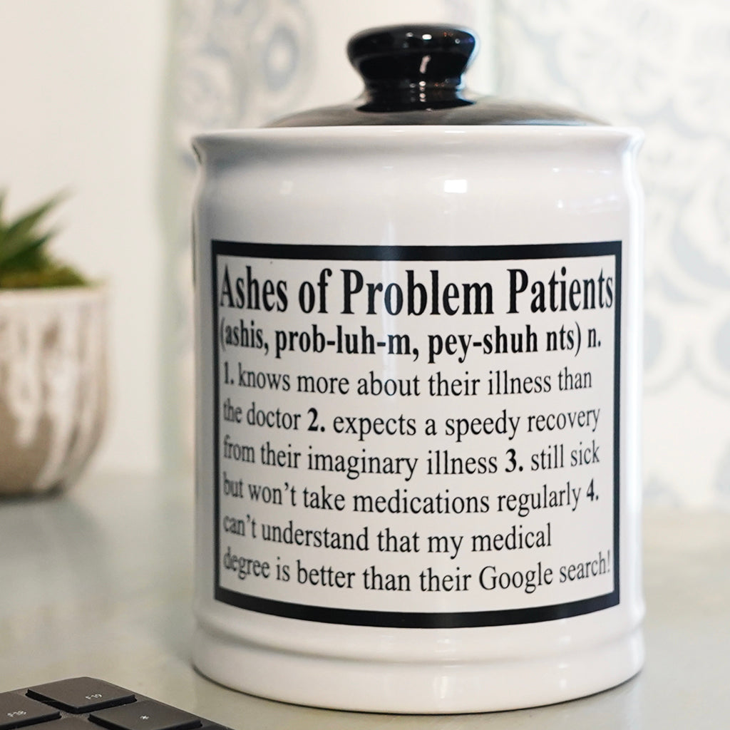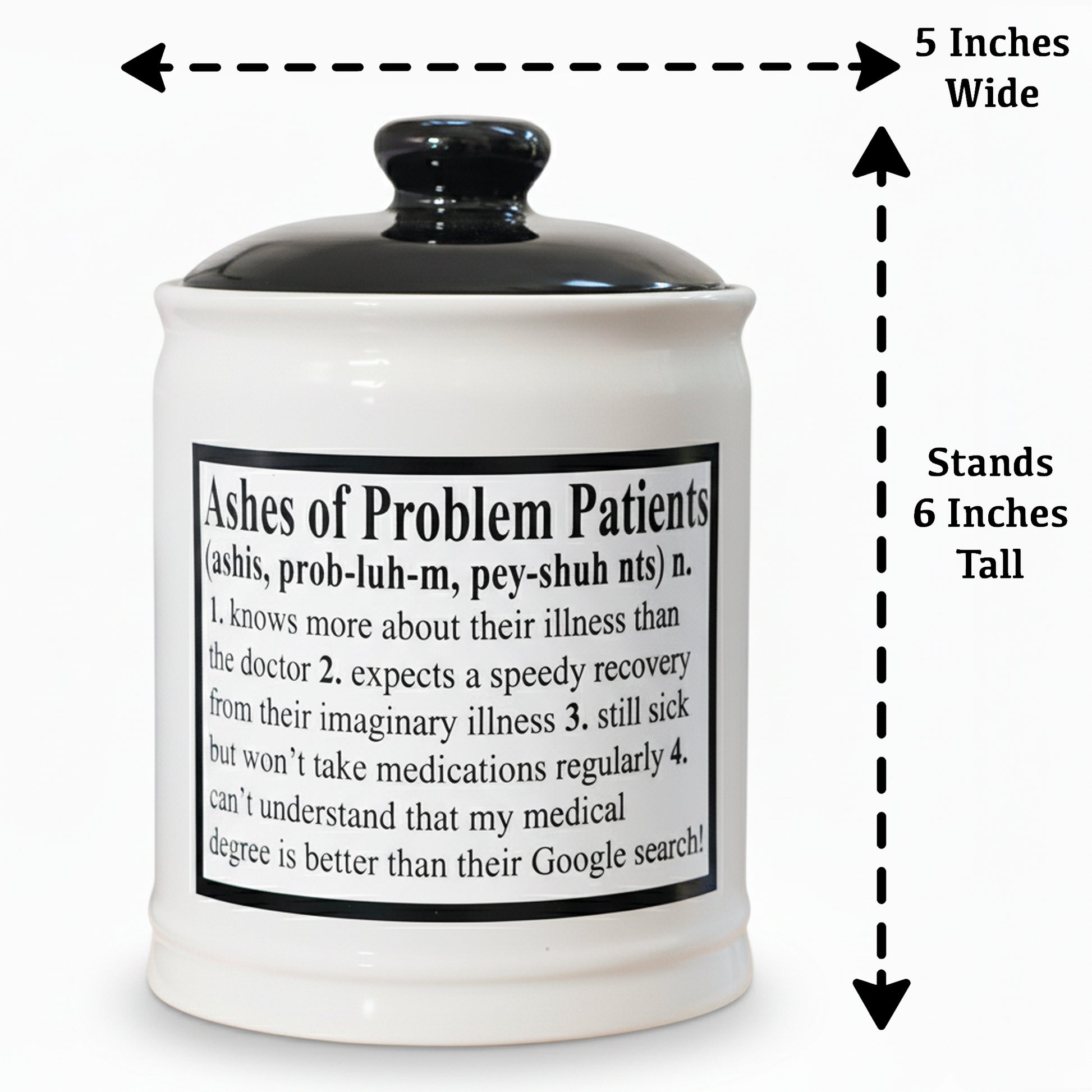 Ashes of Problem Patients ceramic piggy bank, a truly sophisticated piece designed to elevate your house decor while providing a practical solution for money saving. Crafted with meticulous attention to detail, this ceramic jar with lid serves as a storage container, seamlessly blending into any setting, be it home, office, or kitchen. Adult piggy bank is more than just a savings box; it's an embodiment of style and functionality, making it a perfect gift for men and women alike. Whether you're searching for unique men's gifts, thoughtful birthday gifts for women, or distinctive office desk accessories, this piggy bank is a versatile choice. Ideal for those seeking cool stuff that serves a purpose. This piggy bank for adults doubles as a chic piece of desk decor, enhancing any office or bedroom decor with its sleek design. Its substantial size and secure lid make it an excellent choice for storing loose change, serving as a money saving box, coin holder, money bank, and even a humorous gag gift in the form of 'ashes of problem patients.' The jar's elegant stoneware construction ensures durability while adding a touch of sophistication to any space, making it a versatile addition to your living room decor or a quirky centerpiece for coffee table decor. As a unique gift idea, it is perfect as boyfriend gifts, a gift for dad, mom, or even as a thank-you gift for a boss or colleague. Its functionality as a tip jar or savings jar makes it a great choice for those looking to surprise their boyfriend or girlfriend with something unusual. This ceramic jar is not just a practical money-saving jar but also a decorative piece, adding a touch of charm to your kitchen decor or office decor. Embrace the blend of form and function with this exceptional piggy bank, a standout among gifts for men and women who appreciate the finer things in life. Perfect for Christmas gifts, birthday gifts, or just a thoughtful token of appreciation, this jar makes a great gift!