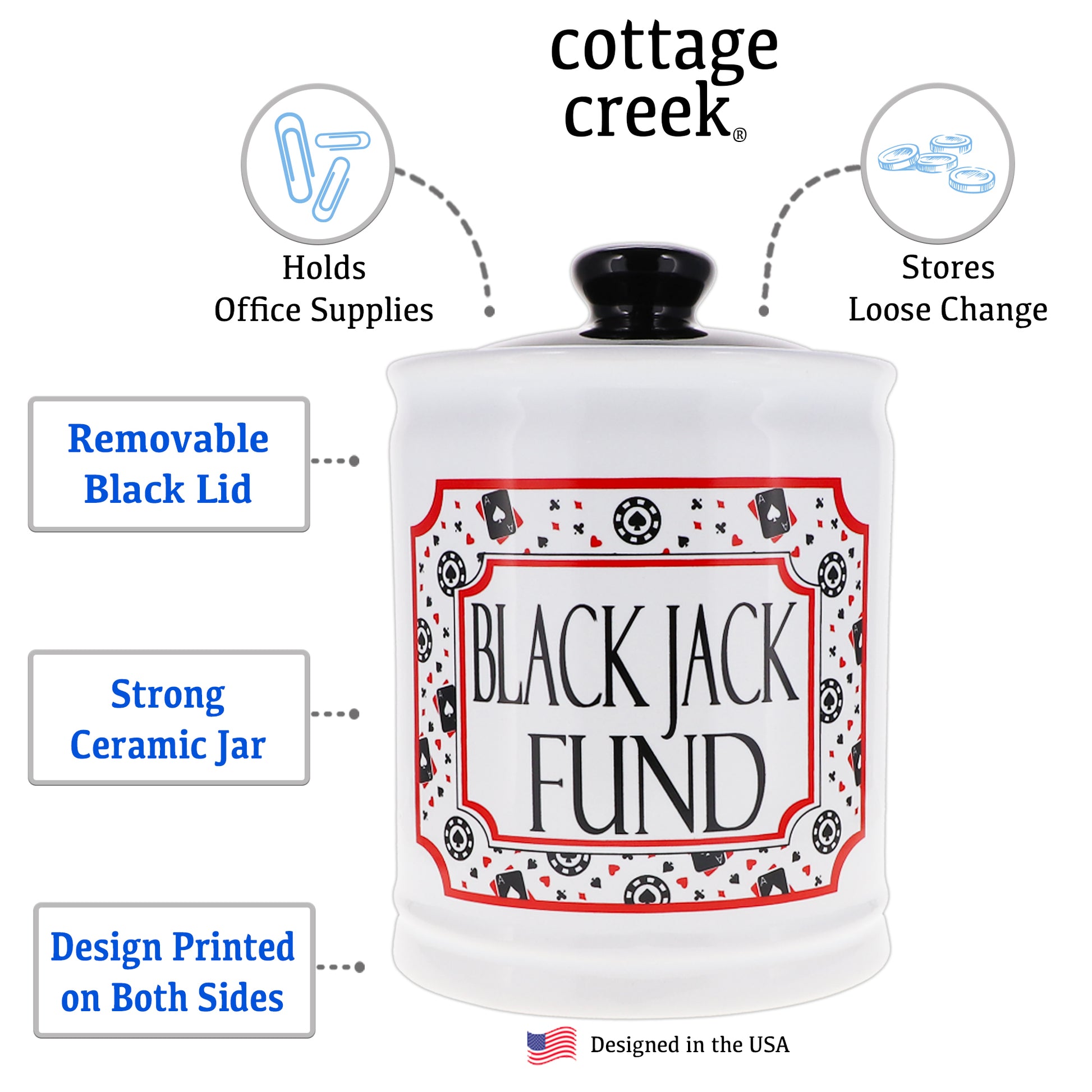 Cottage Creek ceramic jars are made from outstanding stoneware ceramic materials. Our quality money jars are perfect for holding loose change and storing small items. Designs are printed on both sides with a high gloss glazed finish. Each change jar includes a snugly fit removable black lid. Cottage Creek piggy banks arrive in a uniquely designed printed gift box.