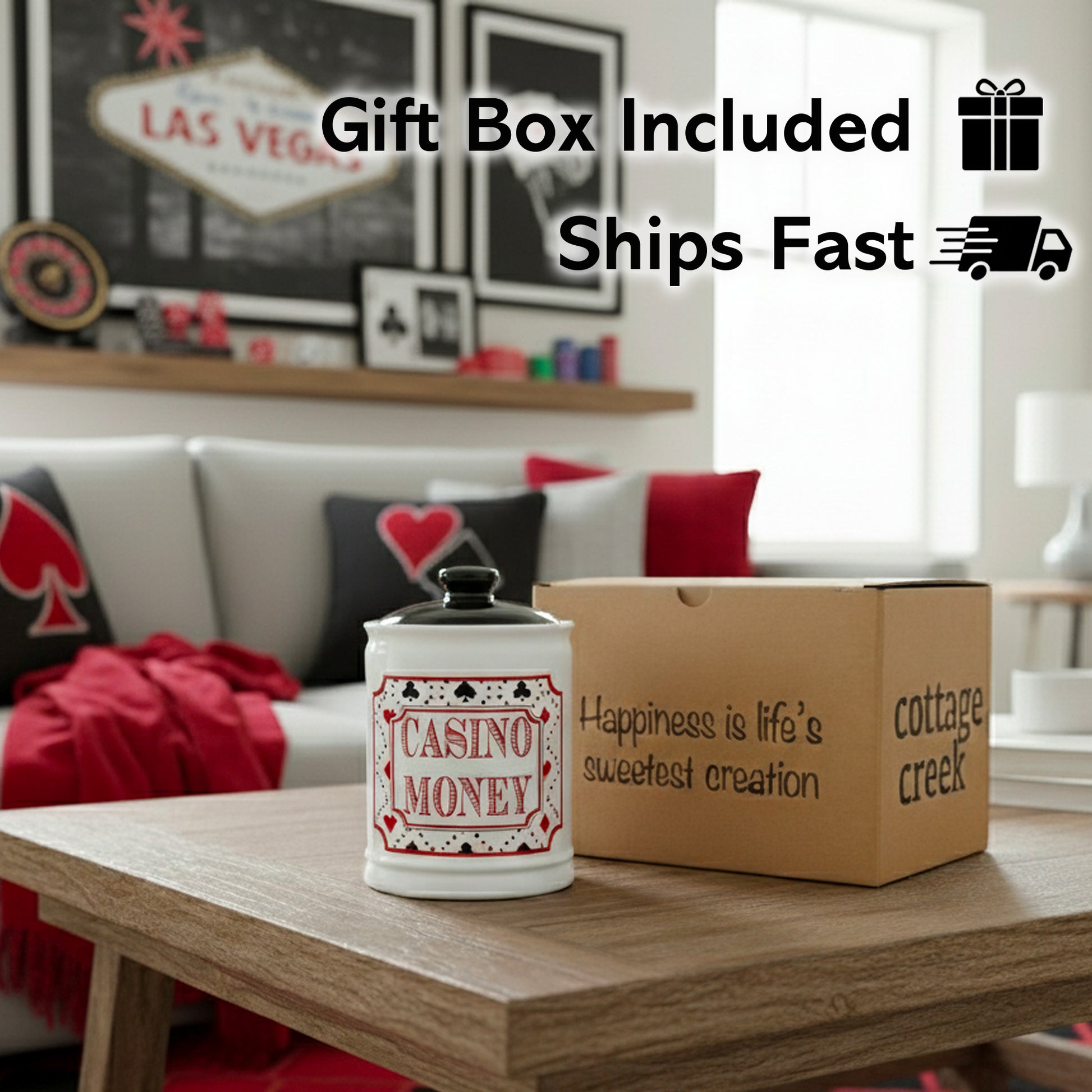 This casino money piggy bank is a unique and exciting addition to our collection of gambling gifts for men. This candy jar with lid is designed with passion and precision; making it a great gift for gamblers and Las Vegas lovers. It doubles as a slot machine piggy bank and an attractive slots casino party decorations. Our home decor piggy bank is made from quality materials that ensure its longevity. This gambling games ceramic jar is a fantastic addition to any man's collection of casino games, electronic games, and slots accessories and it's an adult piggy bank that is a great gifts for women over 50 and gifts for guys. It's also an excellent choice for handheld game enthusiasts who enjoy a good game of video poker on their hand held video game or pocket games. Save for your next pair of gaming socks, hand held games adults, or even slot machines for adults full size with this money saving box. It's a wonderful complement to a digital game table or alongside your electronic game, poker game, slots machine and other casino games . It's a versatile coin jar that can serve as a practical storage space, a stylish decoration, or a fun conversation starter. The Cottage Creek gambling fund jar is the ideal gift for gamblers men, gifts for seniors, boyfriend gifts, gifts for men, Las Vegas gifts, poker gifts for men, best friend gifts for women, gifts for women, gifts for boyfriend, Husband gifts, and casino lovers. This ceramic canister coin bank is an outstanding choice as a gift for poker players, gifts for gamblers, gifts for women who have everything, and gamers. Make someone's day special with this unique gift from Cottage Creek. Whether it's for a birthday, Christmas, or just because, our Casino Money fund jar is a gift that's sure to be remembered. So why wait? Add this incredible Casino cute piggy bank to your cart today!