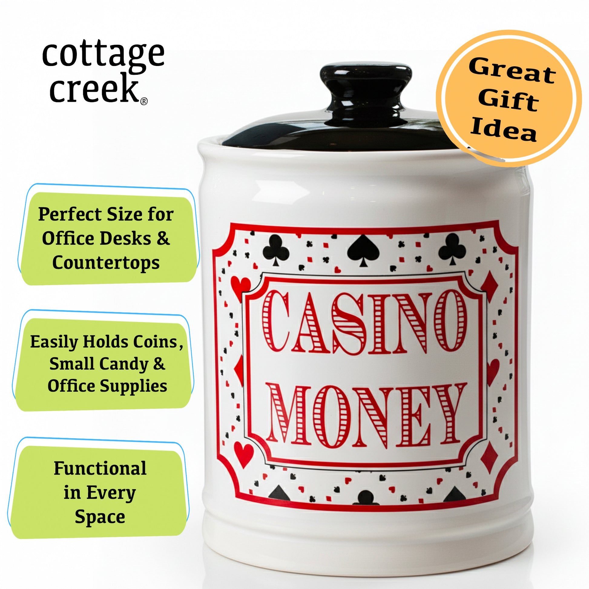 This casino money piggy bank is a unique and exciting addition to our collection of gambling gifts for men. This candy jar with lid is designed with passion and precision; making it a great gift for gamblers and Las Vegas lovers. It doubles as a slot machine piggy bank and an attractive slots casino party decorations. Our home decor piggy bank is made from quality materials that ensure its longevity. This gambling games ceramic jar is a fantastic addition to any man's collection of casino games, electronic games, and slots accessories and it's an adult piggy bank that is a great gifts for women over 50 and gifts for guys. It's also an excellent choice for handheld game enthusiasts who enjoy a good game of video poker on their hand held video game or pocket games. Save for your next pair of gaming socks, hand held games adults, or even slot machines for adults full size with this money saving box. It's a wonderful complement to a digital game table or alongside your electronic game, poker game, slots machine and other casino games . It's a versatile coin jar that can serve as a practical storage space, a stylish decoration, or a fun conversation starter. The Cottage Creek gambling fund jar is the ideal gift for gamblers men, gifts for seniors, boyfriend gifts, gifts for men, Las Vegas gifts, poker gifts for men, best friend gifts for women, gifts for women, gifts for boyfriend, Husband gifts, and casino lovers. This ceramic canister coin bank is an outstanding choice as a gift for poker players, gifts for gamblers, gifts for women who have everything, and gamers. Make someone's day special with this unique gift from Cottage Creek. Whether it's for a birthday, Christmas, or just because, our Casino Money fund jar is a gift that's sure to be remembered. So why wait? Add this incredible Casino cute piggy bank to your cart today!