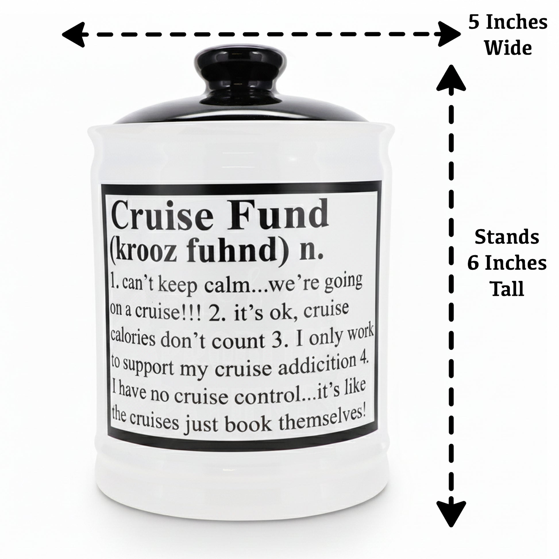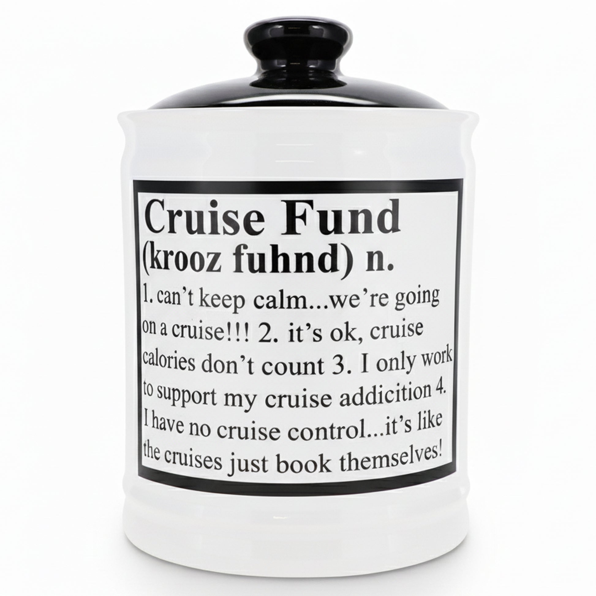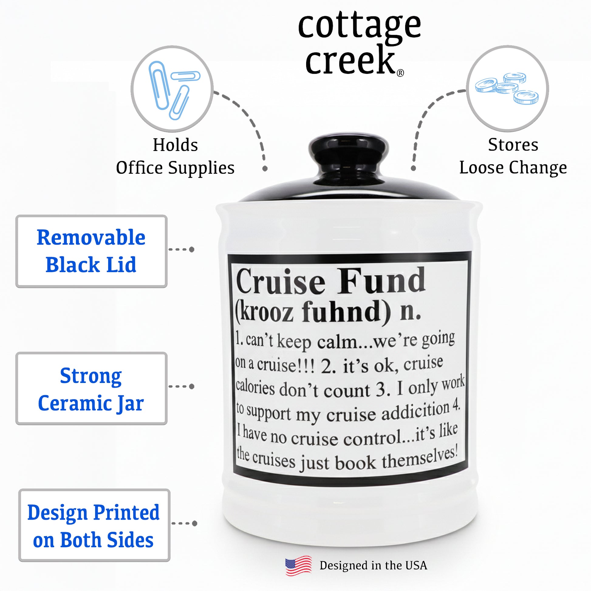 Set sail on your savings journey with the Cottage Creek Cruise Fund Piggy Bank. This beautifully crafted ceramic jar is more than just an adult piggy bank; it's a stylish and practical way to save for your dream vacation or next cruise. Made from high-quality stoneware and kiln-fired for ultimate durability, the humorous phrase "Cruise Fund" is permanently fused to the jar, ensuring it will never fade or scratch.