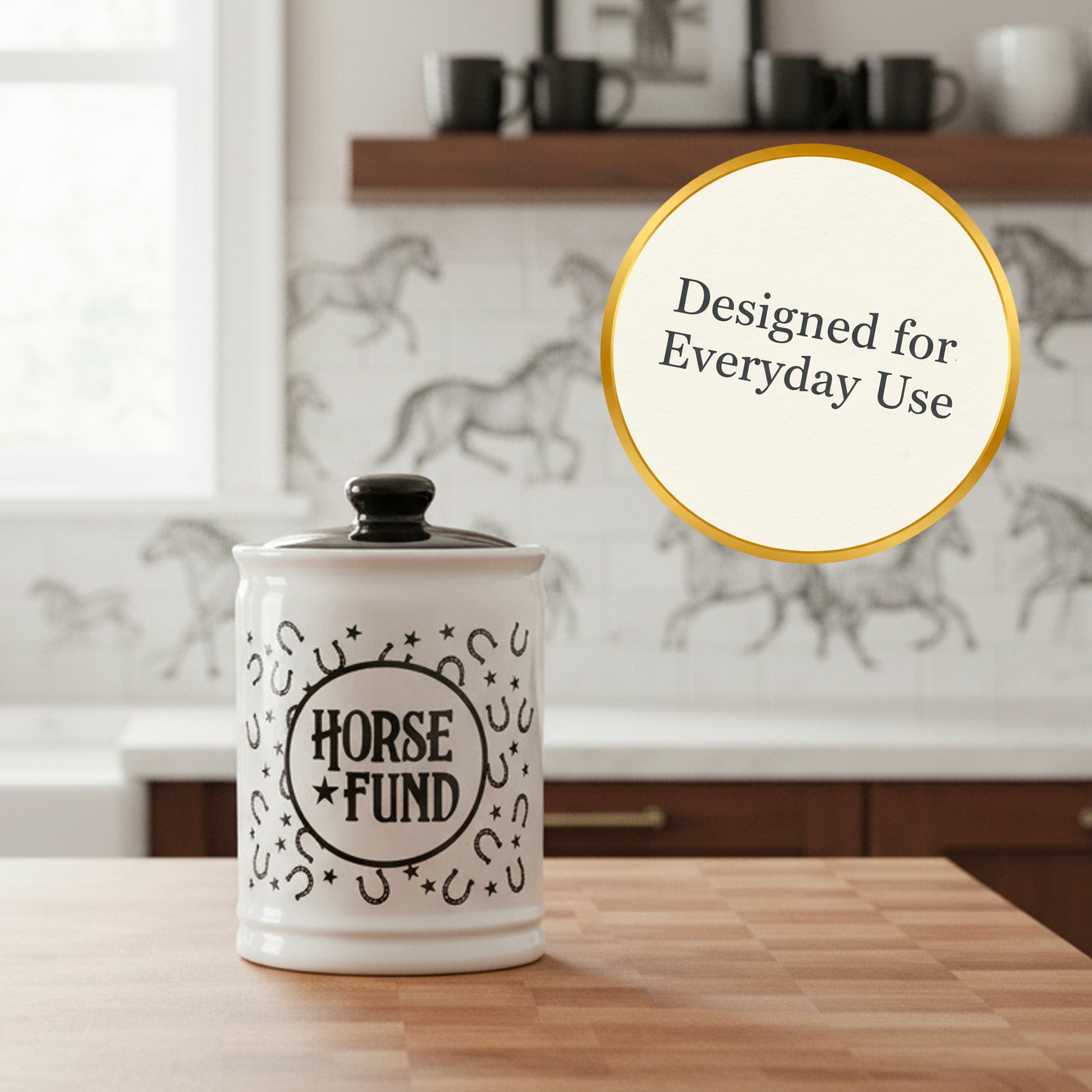 Crafted by Cottage Creek, this 6-inch tall ceramic jar is made from high-quality, durable stoneware. The classic black and white design with stars and horseshoes gives it a sophisticated Western decor and equestrian decor appeal, making it a superior adult piggy bank that looks fantastic as home decor, kitchen decor, living room decor and horse decorations for the office. The kiln-fired design ensures the inspiring message and fun phrases about the great things about horses on the back will never fade.