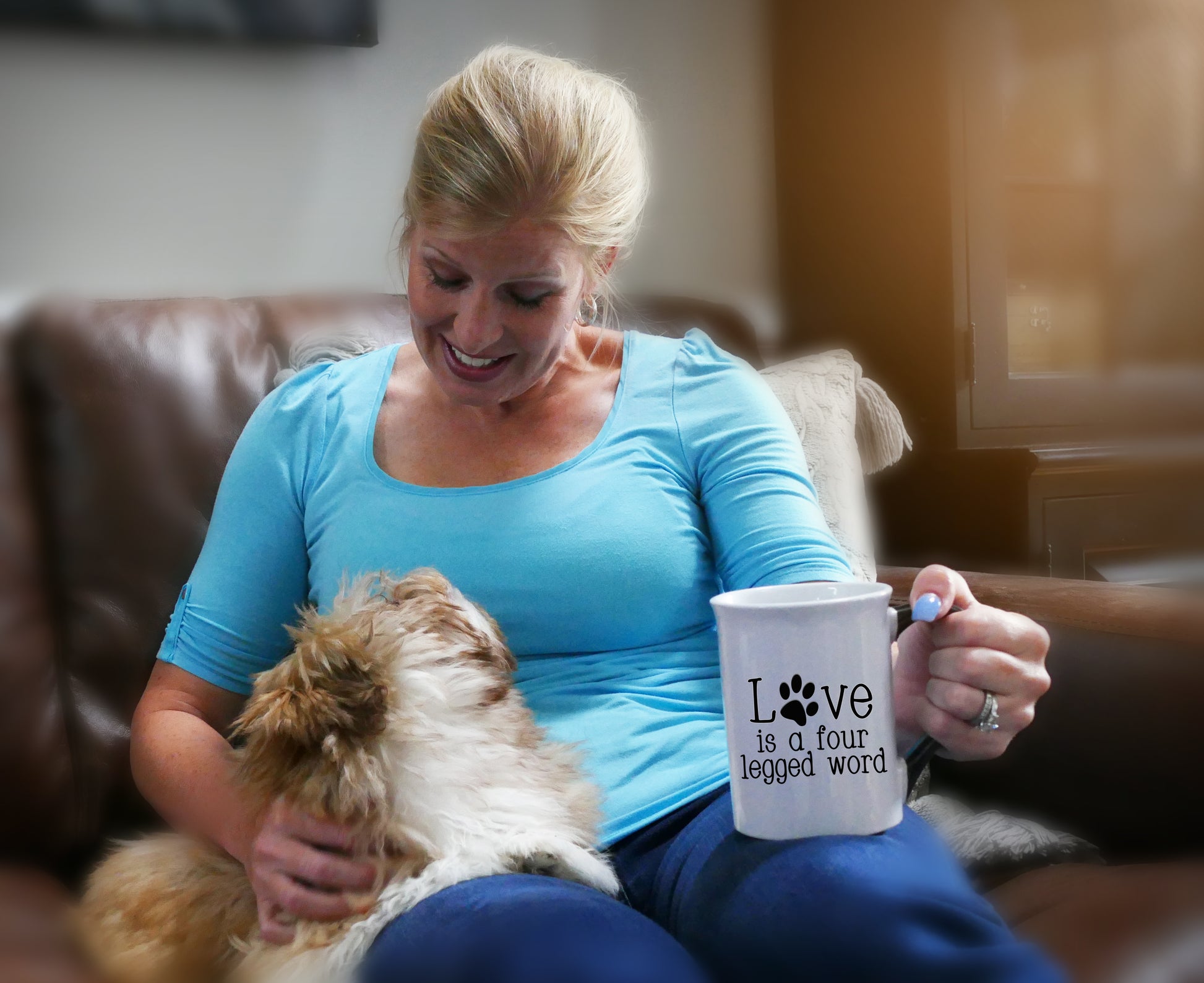 Cottage Creek's Love is a Four Legged Word funny coffee mug is a ceramic mug, dog mom mug and dog dad mug dog lovers cannot live without! This dog coffee mug is intricately designed with playful dog-themed graphics making it an ideal dog lover gifts or dog lovers gifts for women.