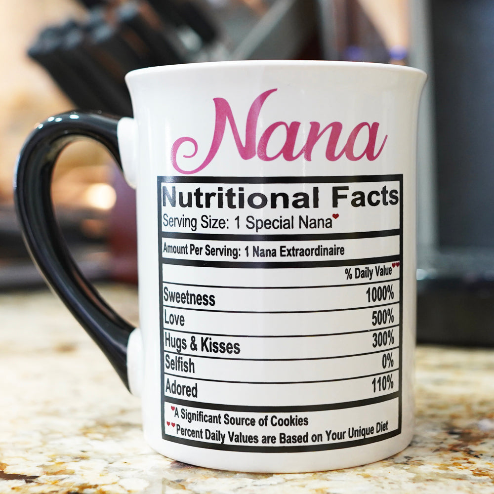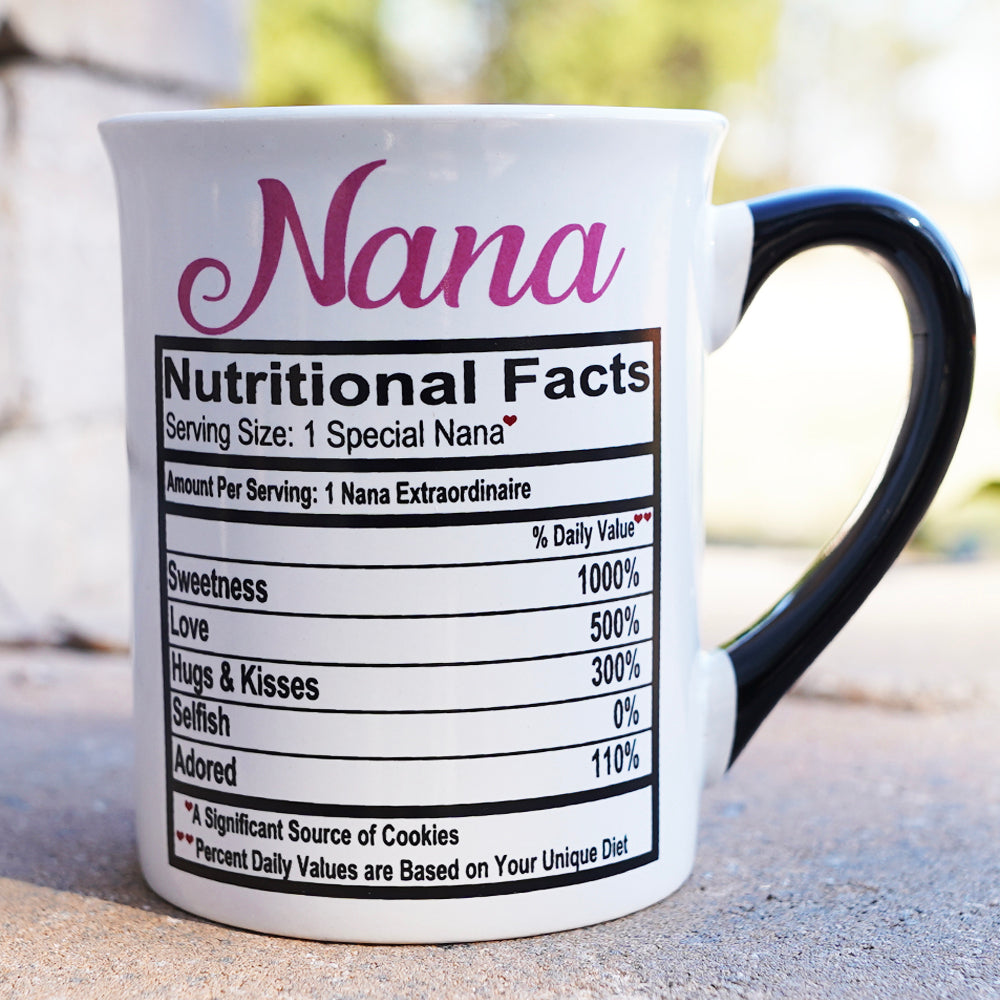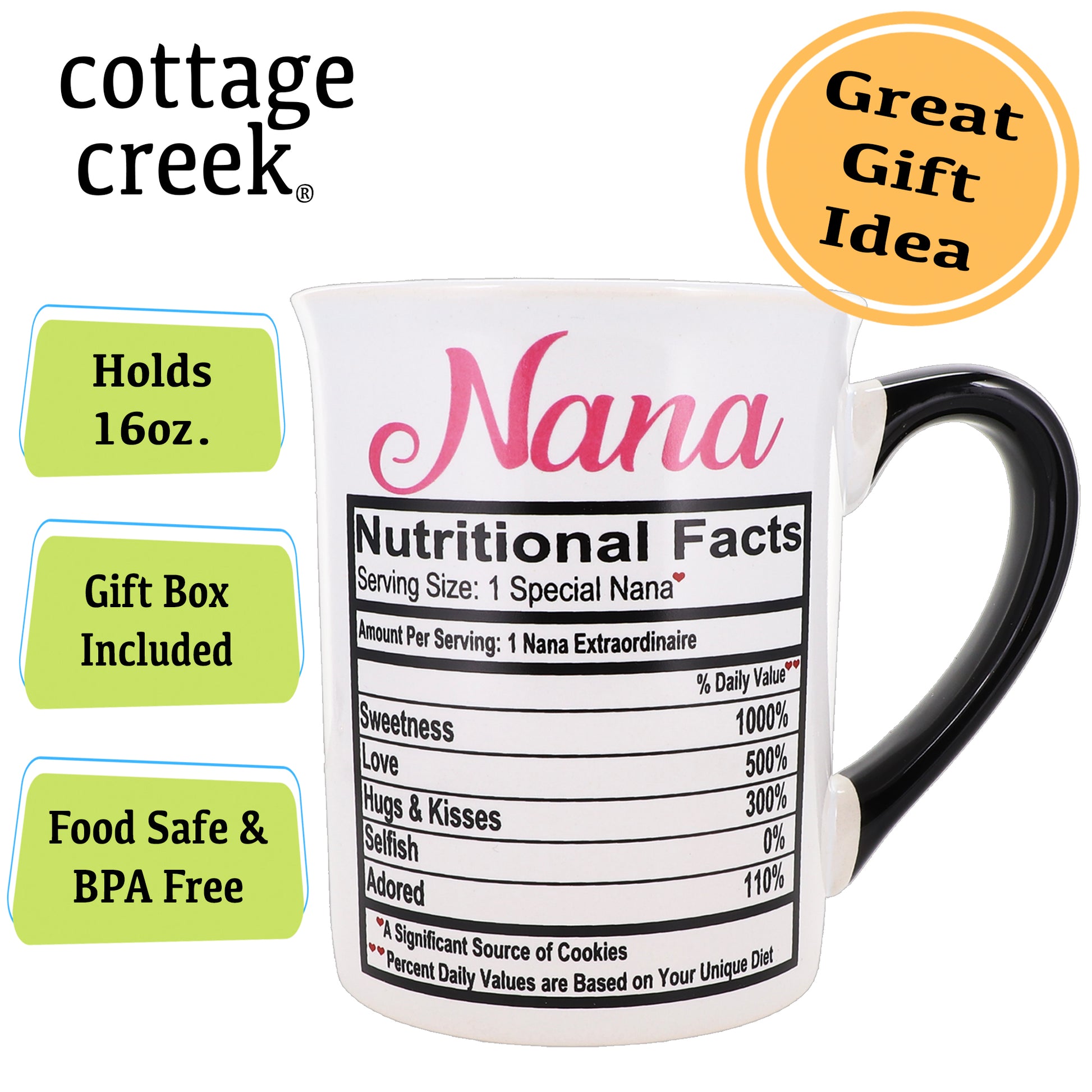 Nana will be delighted to receive this one of a kind Nana coffee mug from Cottage Creek! This Cottage Creek Nana coffee mug is hand dipped in lead-free glossy white glaze, twice kiln-fired, and is constructed using only the best strong, reliable and superior ceramic stoneware materials. Cottage Creek Nana Nutrition mug has fade resistant designs on each side and are strong enough for everyday use, yet lightweight for easy handling. All Cottage Creek Nana cups are microwave and dishwasher safe, as well as 100% food safe. These unique Nana mugs come in a fun, printed gift box making this Nana mug perfect Nana birthday gifts for Nana, holiday Nana gifts and more!