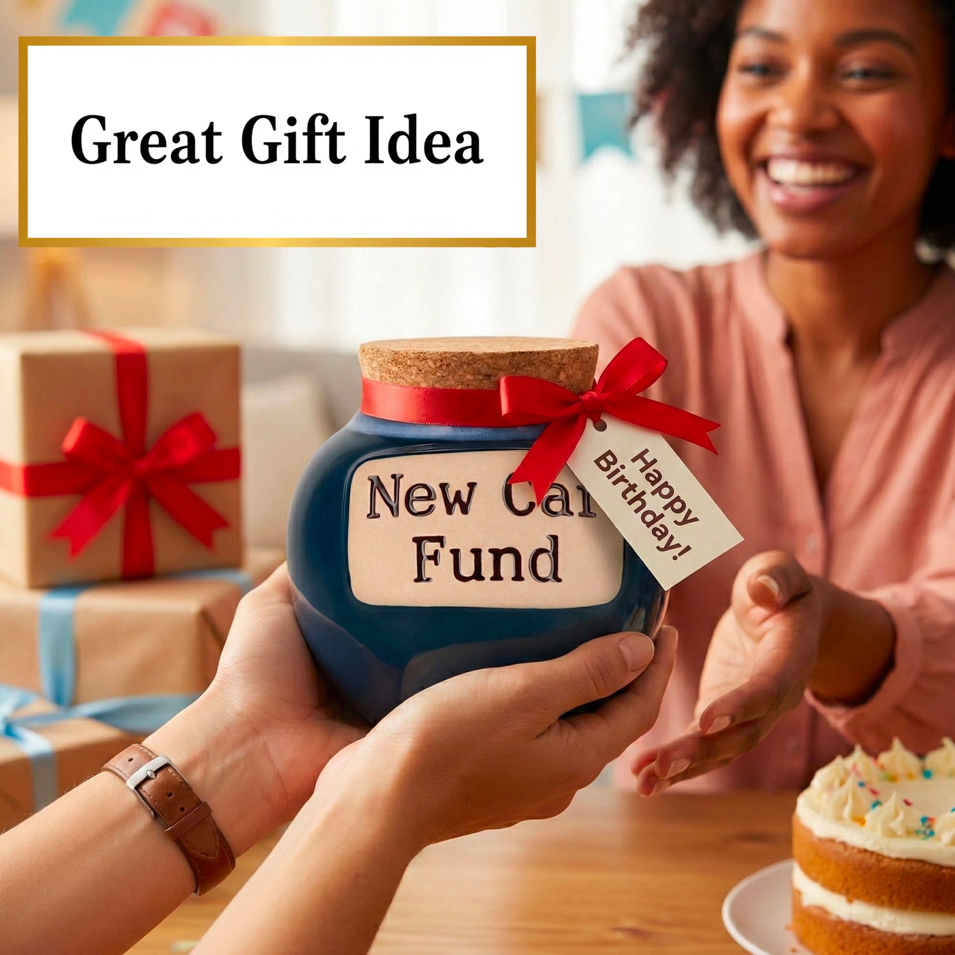 The Cottage Creek New Car Fund Jar is the champion of gifts, arriving in a sturdy gift box that makes wrapping a breeze. It stands out as the perfect present for car lovers, men, and women. Use it as a unique stocking stuffers for women, birthday gifts for women, gifts for him, dad gifts, mom gifts and gifts for boyfriend. From fashionable living room decor and kitchen decor to mens Christmas gifts, this ceramic coin bank sends a message of support and excitement. Don't settle for a boring shoebox; upgrade your savings game with a new car fund bank car piggy bank for adults that looks as good as the car you are going to buy. Start your engine and start saving today!
