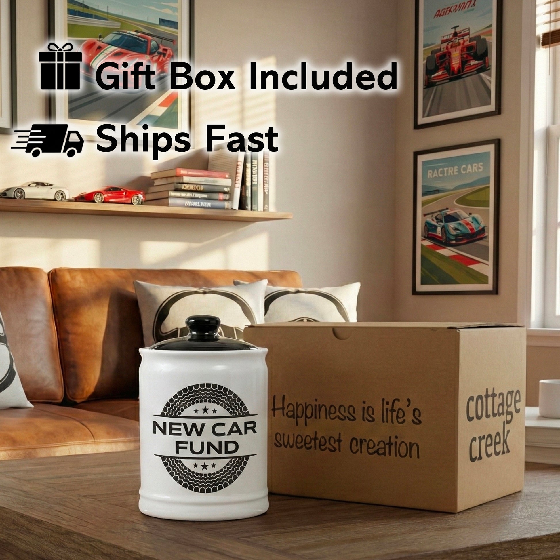 The Cottage Creek New Car Fund Jar is the champion of gifts, arriving in a sturdy gift box that makes wrapping a breeze. It stands out as the perfect present for car lovers, men, and women. Use it as a unique stocking stuffers for women, birthday gifts for women, gifts for him, dad gifts, mom gifts and gifts for boyfriend. From fashionable living room decor and kitchen decor to mens Christmas gifts, this ceramic coin bank sends a message of support and excitement. Don't settle for a boring shoebox; upgrade your savings game with a new car fund bank car piggy bank for adults that looks as good as the car you are going to buy. Start your engine and start saving today!