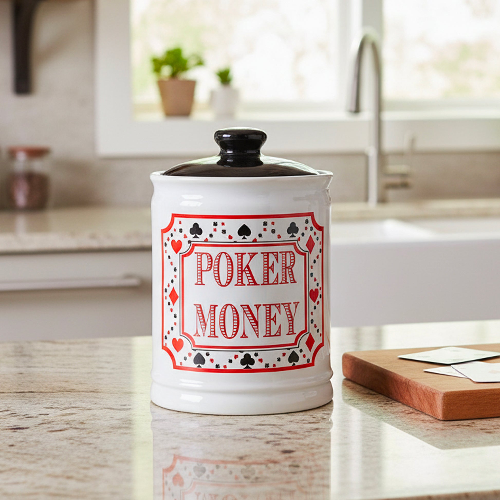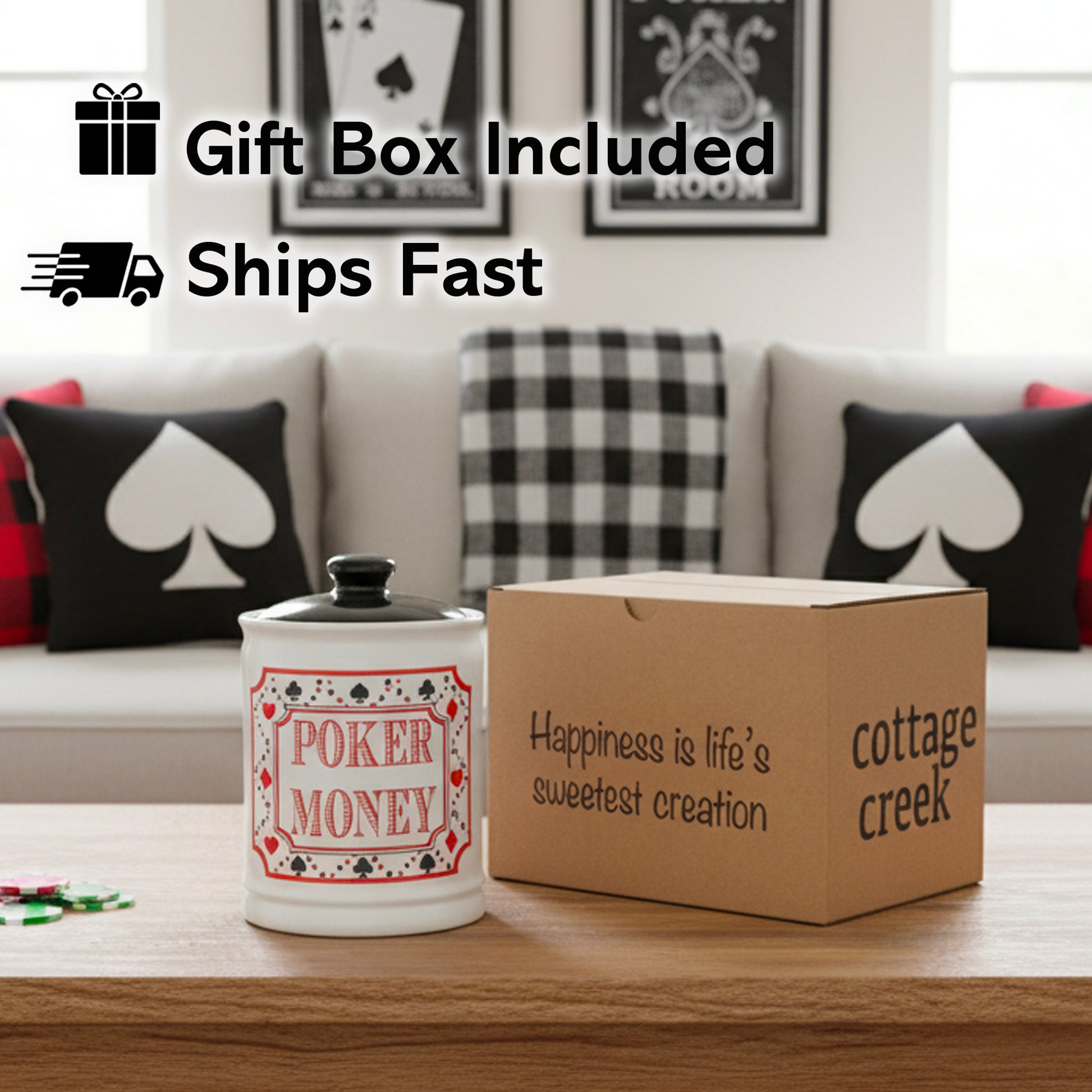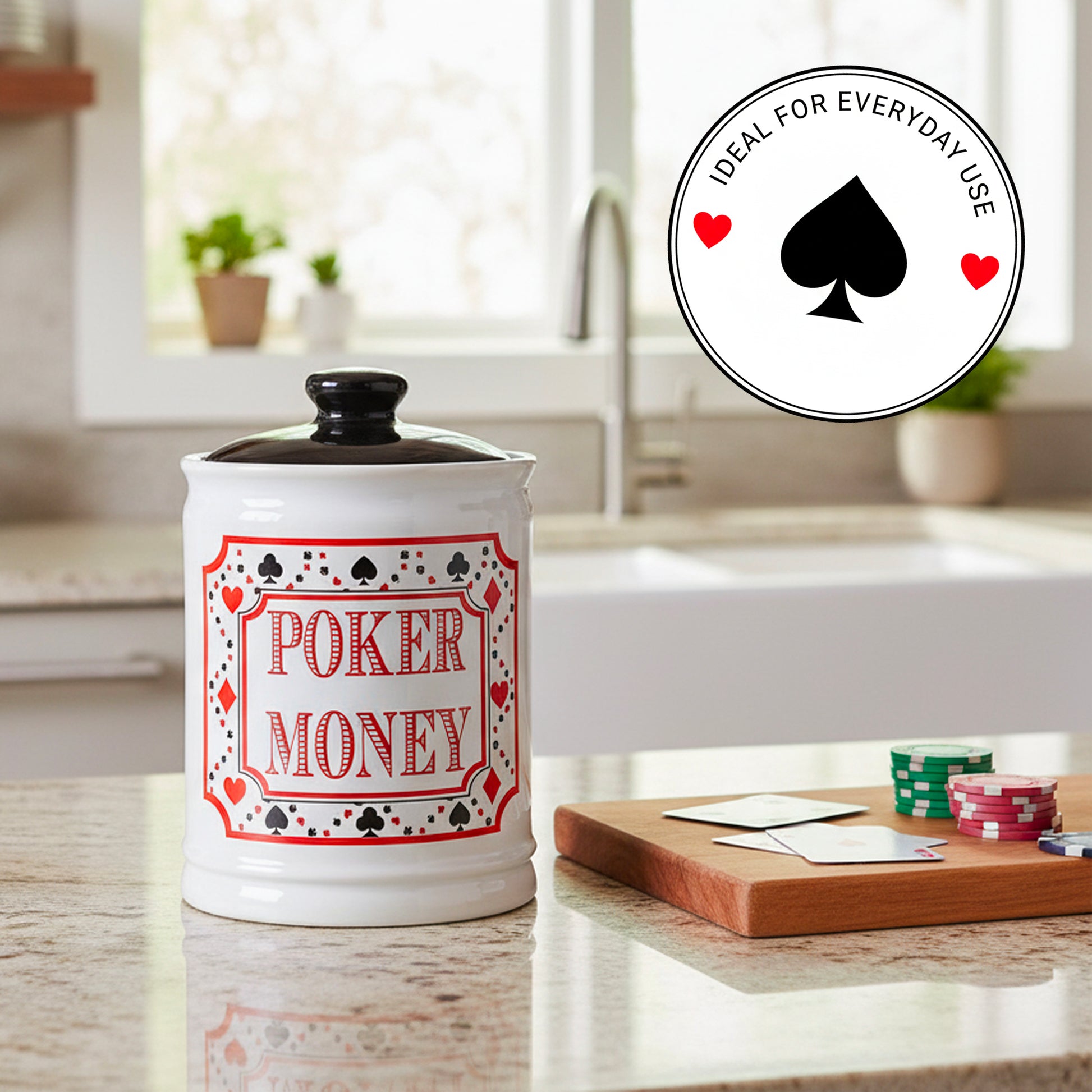 Poker players, card players, gamblers and more will be delighted to receive this one of a kind Poker Money ceramic piggy bank for adults from Cottage Creek! This Poker Money Bank is perfect as Poker themed party decorations, Poker themed party supplies, Poker decorations, Poker party decor and more. This unique ceramic Poker savings bank is hand dipped in lead-free glossy white glaze, twice kiln-fired, and is constructed using only outstanding ceramic stoneware materials. Our money boxes for adults money box, money jar has fade resistant designs on each side, are strong enough for everyday use and make fantastic coin banks and coin holders to hold loose change. One of a kind jars with lids are excellent cash jars to hold loose bills as well. Novelty office jars are 100% food safe making them ideal candy jars and jelly bean jars. These fun office decor jars will be perfect as a candy jar for office desks, candy bowl for office, funny candy jar and a candy dish for office desk! Use this versatile Casino Money Poker jar around the home as a makeup jar, pen holder, rubber band holder, cotton ball and qtip holder, hair accessories organizer and more! Our fun piggy bank comes in a designed gift box, making this cute jar the perfect casino theme party decorations, casino gifts, slots machine decor, poker gifts, gambling gifts, casino lovers gifts, card player gifts, slots gifts, slots and shots gifts, gambler gifts and more.