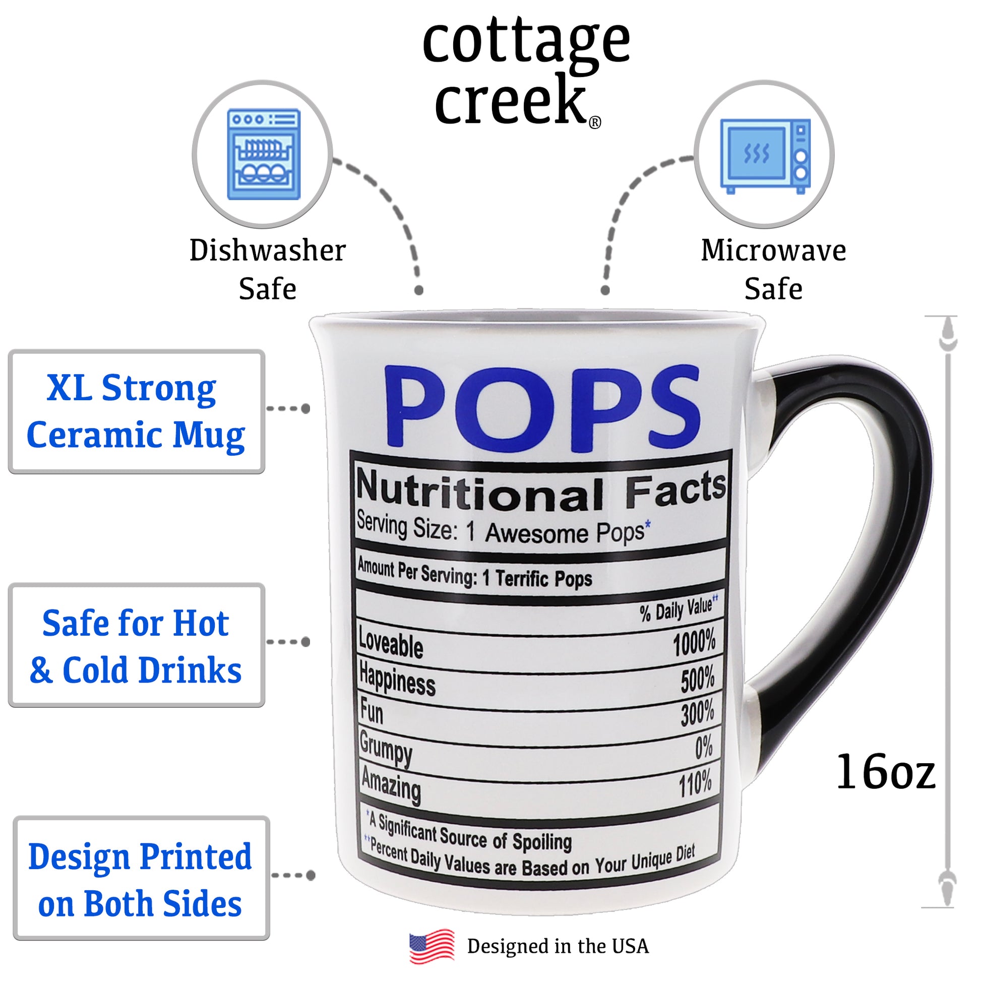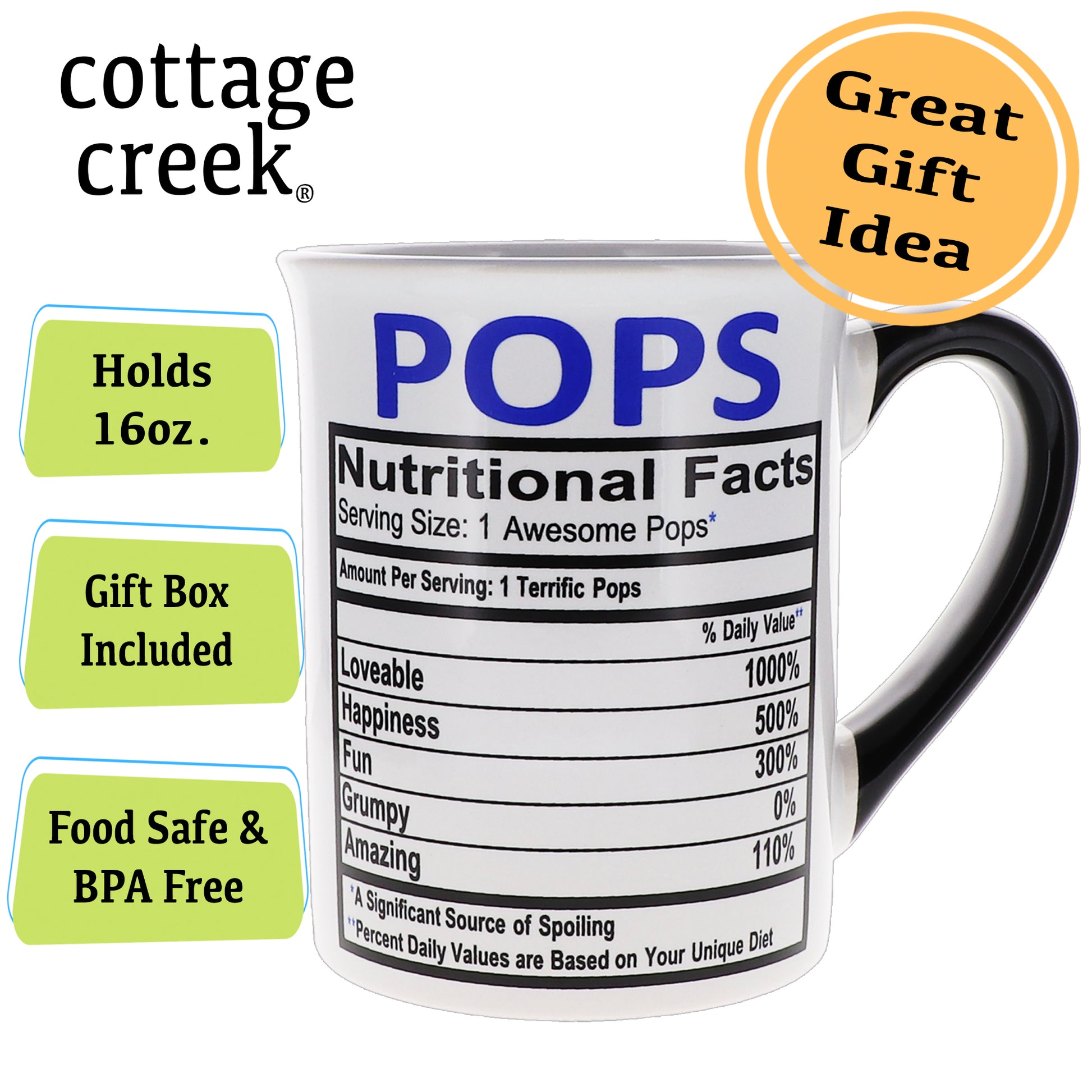 Pops will be delighted to receive this one of a kind Pops coffee mug from Cottage Creek! This Cottage Creek Pops mug for Pops holds 16oz., is hand dipped in lead-free glossy white glaze, twice kiln-fired, and is constructed using only outstanding ceramic stoneware materials. Cottage Creek Pops Grandpa mug has fade resistant designs on each side, are strong enough for everyday use and are big coffee mugs with handles. All Cottage Creek Pops cups are microwave and dishwasher safe, as well as 100% food safe. These unique Pops Papa cups come in a uniquely designed printed gift box making this Pops mug perfect Pops birthday gifts for Pops, holiday Pops gifts and more!
